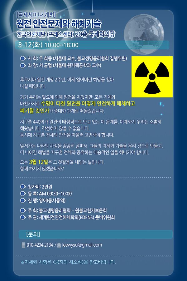 Çö´ë ¹®¸í»çȸ¿¡¼ ÇÙÀ» µÎ·Á¿ö¸¸ ÇØ¼´Â ¾È µË´Ï´Ù. ±×·¸´Ù°í ÇÙÀ» µÎ·Á¿öÇÏÁö ¾Ê´Â °ÍÀº ´õ À§ÇèÇÕ´Ï´Ù. ÇÙ¹ßÀüÀÇ ÁöÇý·Î¿î ÀÌ¿ë°ú °ü¸®´Â Àηù ¹®¸íÀÇ »õ·Î¿î ȵÎÀÔ´Ï´Ù. Áö±¸»ó ¸ðµç »ý¸í°ú ÀηùÀÇ ¹ø¿µ¿¡ ¾ÈÀüÇÑ °ÉÀ½À» ¶¿ ¼ö ÀÖ´Â ÇÙÁ¤Ã¥ÀÇ À¯¿¬ÇÑ º¯È¸¦ Èñ¸ÁÇϸç, ¼ö¸íÀÌ ´ÙÇÑ ¿øÀüÀÇ ¾ÈÀü¹®Á¦¿Í ÇØÃ¼±â¼ú¿¡ ´ëÇÑ ÇØ¹ýÀ» ±¹Á¦°øÁ¶¸¦ ÅëÇØ ¸ð»öÇϰíÀÚ ÇÙ¾ÈÀü °ü·Ã ±¹³»¿Ü Àü¹®°¡µéÀÌ ÇÔ²² ¸ðÀÎ À̹ø ¼¼¹Ì³ª´Â ±× ù°ÉÀ½ÀÌ µÉ °ÍÀÔ´Ï´Ù. ÇâÈÄ ¡®¼¼°è¿øÀü¾ÈÀüÇØÃ¼ÇÐȸ¡¯ EDENS (Environmental Decommissioning Engineering Nuclear Safety)ÀÇ Ã¢¸³À» ÁغñÇÏ´Â ½Ã¹ßÁ¡À¸·Î¼ ÁøÁöÇϰí dz¼ºÇÑ ³íÀǰ¡ ÀÌ·ç¾îÁ® ÇÙ¹®ÈÀÇ »õ·Î¿î ¹æÇ⟰¡ µÇ±â¸¦ ±â´ëÇØ¸¶Áö ¾Ê½À´Ï´Ù.