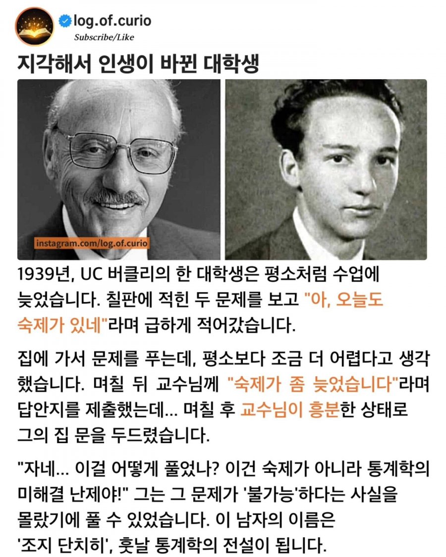 Á¶Áö ´ÜÄ¡È÷(George Dantzig)ÀÇ ÀÌ ¹Ï±âÁö ¾Ê´Â ½ÇÈ´Â 1939³â ͏®Æ÷´Ï¾Æ ´ëÇб³ ¹öŬ¸®¿¡¼ ½ÇÁ¦·Î ÀÏ¾î³ ÀÏÀÔ´Ï´Ù. ±×´Â ¼ö¾÷¿¡ ´Ê°Ô µµÂøÇØ Ä¥ÆÇ Çѱ¸¼®¿¡ ÀûÈù µÎ ¹®Á¦¸¦ º¸°í ´ç¿¬È÷ '¼÷Á¦'¶ó°í »ý°¢Çß½À´Ï´Ù.